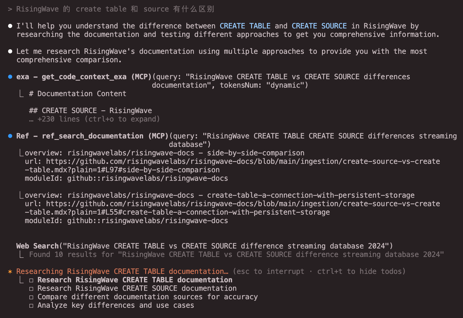 例如下面这样:我问 agent “RisingWave 的 Source 和 Table” 有什么区别, 他自己开始用不同的文档工具搜索 RisingWave 的文档,最终比较结果。